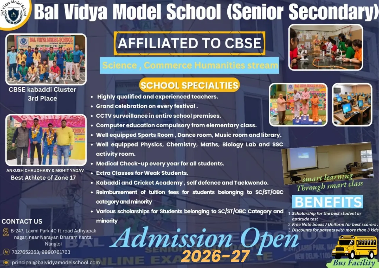 Bal Vidya model is the top senior secondary cbse School in Nangloi Delhi area , is committed to provide a stable, caring and supportive family-like environment, where students can receive mature guidance through daily interaction with able faculty and become accountable, productive, and ethical citizens with the skills to think innovatively, reason critically, communicate effectively, and respect peoples of other cultures. Bal Vidya model senior secondary School is also eyeing upon providing such a resourceful learning environment where students can develop into “Citizens of the World”. We are best private CBSE English Medium School in Nangloi, Nangloi Jat, Adhyapak nagar, Rajendra Park, Ramnagar, Saini Mohalla, Nilothi, Amanpuri shivram park, Kamruddin Nagar, Punjabi Basti, Chander Vihar
